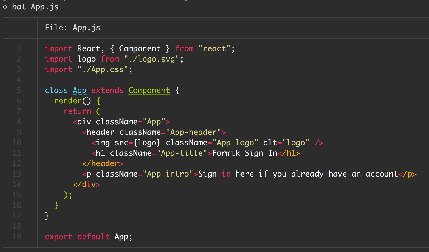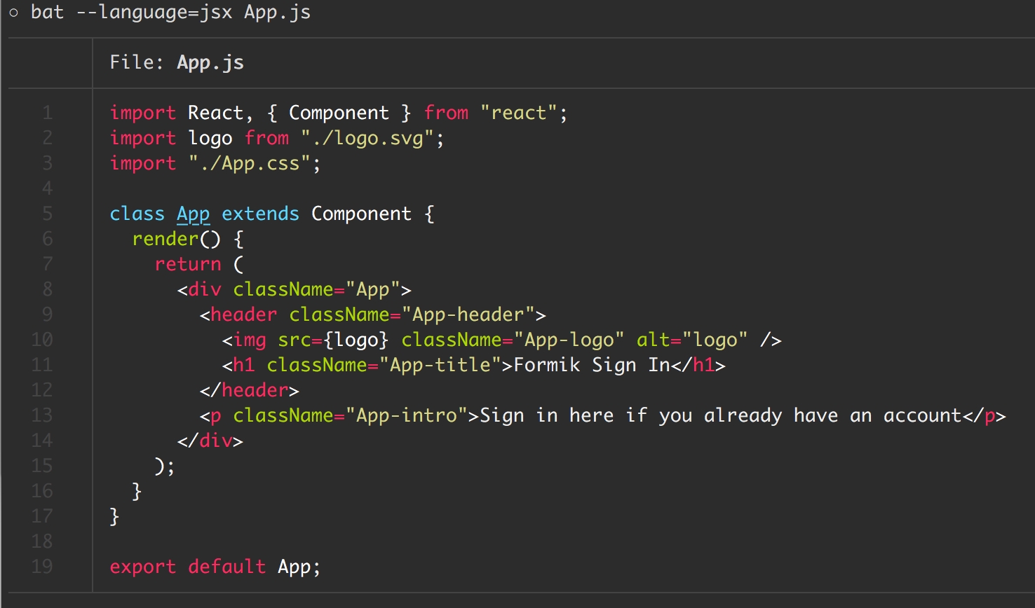 The jsx syntax doesn't look great because of the inferred language highlighting doesn't account for it. We can get better results by telling bat that the file should be parsed as JavaScript (Babel).