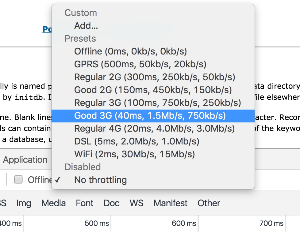 From here we can select the connection speed we want to simulate. If we then reload the page, we will not only experience the page load at that speed, we will also see the numbers in that Network tab.